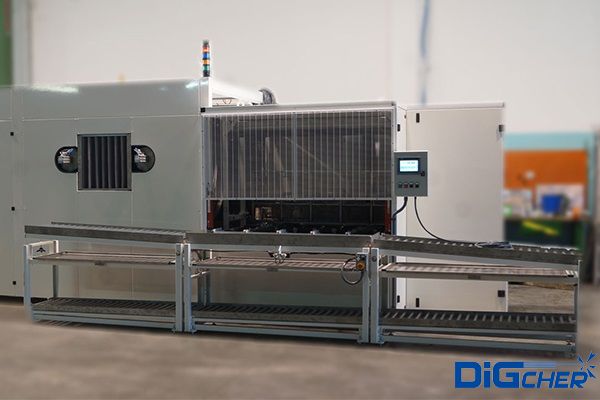 PT-6 SSDA 大軸承通過式清洗線采用動力輥子輸送(sòng)上料,網帶帶動工件一次(cì)進入噴淋清洗工位、噴淋漂洗工位、烘(hōng)幹工位及霧化上油工位。采用知(zhī)名品牌PLC實現清(qīng)洗過程全自動準確控製,可(kě)變頻調速。