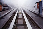高速動車組列車在高速行駛中帶起的雪花結成了冰,附著(zhe)在列車地盤上,這些冰層會影響機械師對列車(chē)地盤的檢查,對行車安全帶來隱患。因(yīn)此在檢修前,機械師們先要把列車地盤和(hé)輪(lún)軸上的冰清除幹淨。這些冰大多聚集在地盤零件的空隙裏,凍(dòng)的非常結實,要(yào)想(xiǎng)把它們處理幹淨,傳統的(de)方法是用特製的工具,一點點往下鏟。為此,北京www.91潔清潔設備有限公司(sī)組織技術力量,研發了一款全自(zì)動高速動車組列車底盤、輪軸除冰係統。