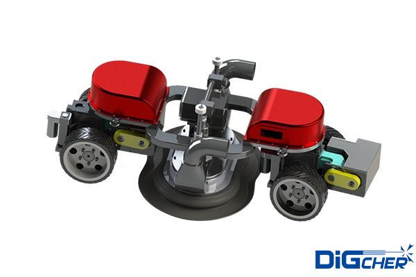 爬壁機(jī)器人采用永磁吸附、輪式移(yí)動方式,可搭載120 kg重量,能(néng)夠牢牢吸附在物體表麵,實現靈活的(de)前進、後退、轉彎等動作,並具有一定的曲麵越障能力,可靈活應對儲罐(guàn)壁麵的(de)焊縫等情況。