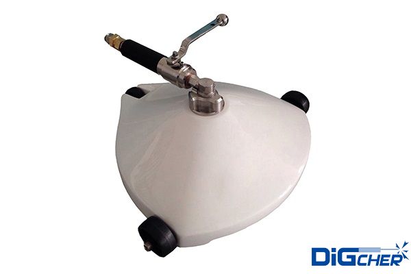 空化射流清洗(xǐ)盤內部配有三個空化噴嘴,正常工作狀態下,空化噴嘴高速旋轉,內部可形成負壓腔,通過產生的負(fù)壓自動吸附在被清(qīng)洗表麵,依靠水力噴射推進自行前進,前進速度可調。