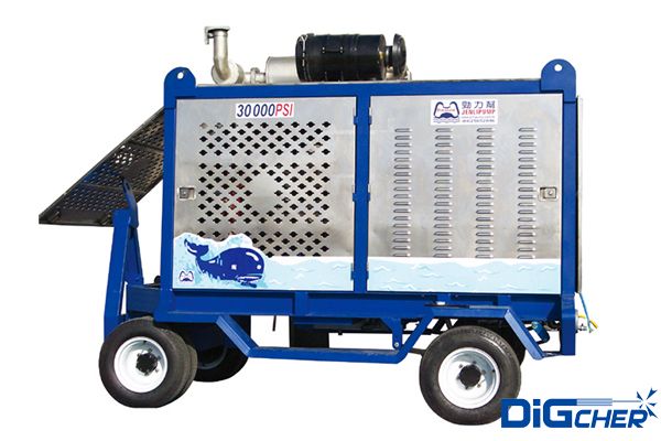 www.91潔 DJ 2000/20DT 2000公(gōng)斤壓力(lì)進口柴油超高壓清洗機采用康明斯(sī)95kw柴(chái)油發動機作為動(dòng)力源,高壓泵為美國原裝三柱塞泵,設計有三級進水過濾器,並采用特種不鏽鋼泵(bèng)頭、不鏽鋼閥門及柱塞、高技術密封填料(liào);曲軸箱采(cǎi)用飛濺潤滑;設計有變頻調速係統;配備氣動旋轉槍(qiāng);安全閥(fá)采用爆破膜式,安全可靠。